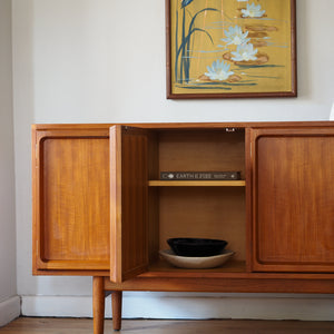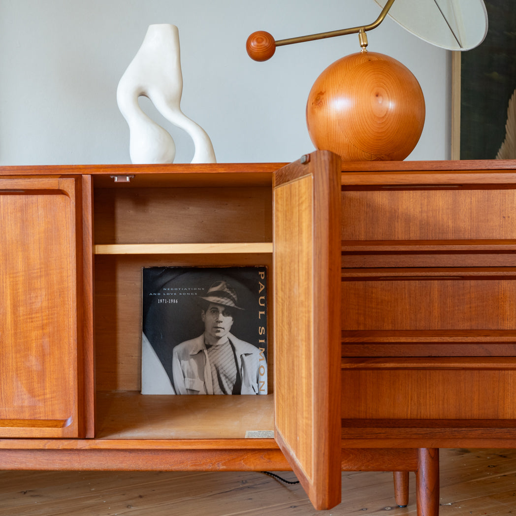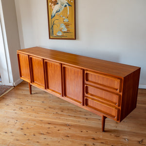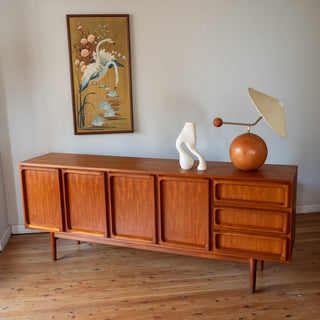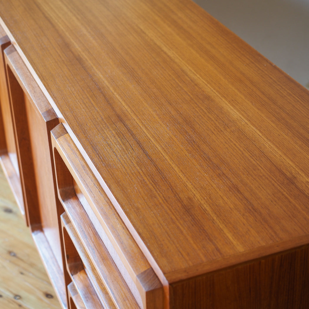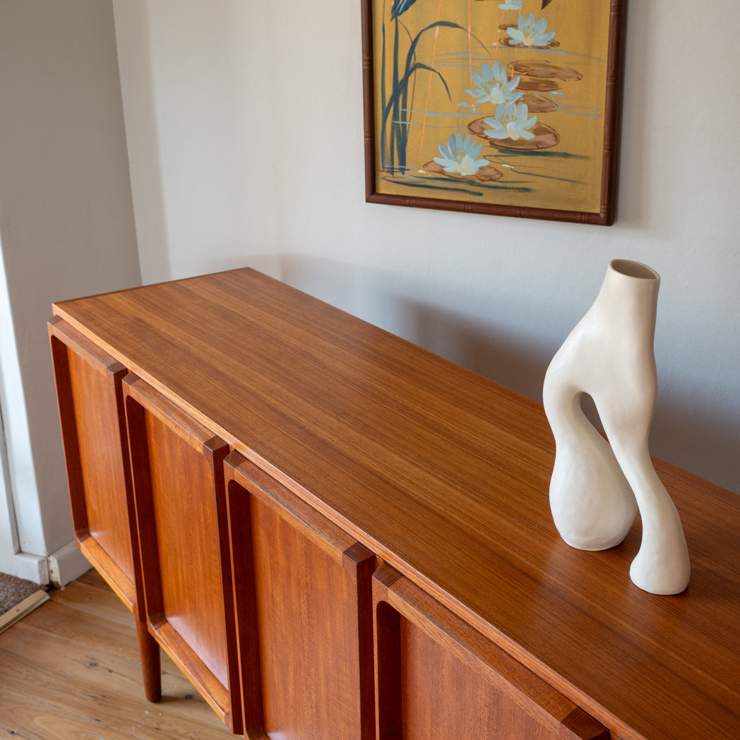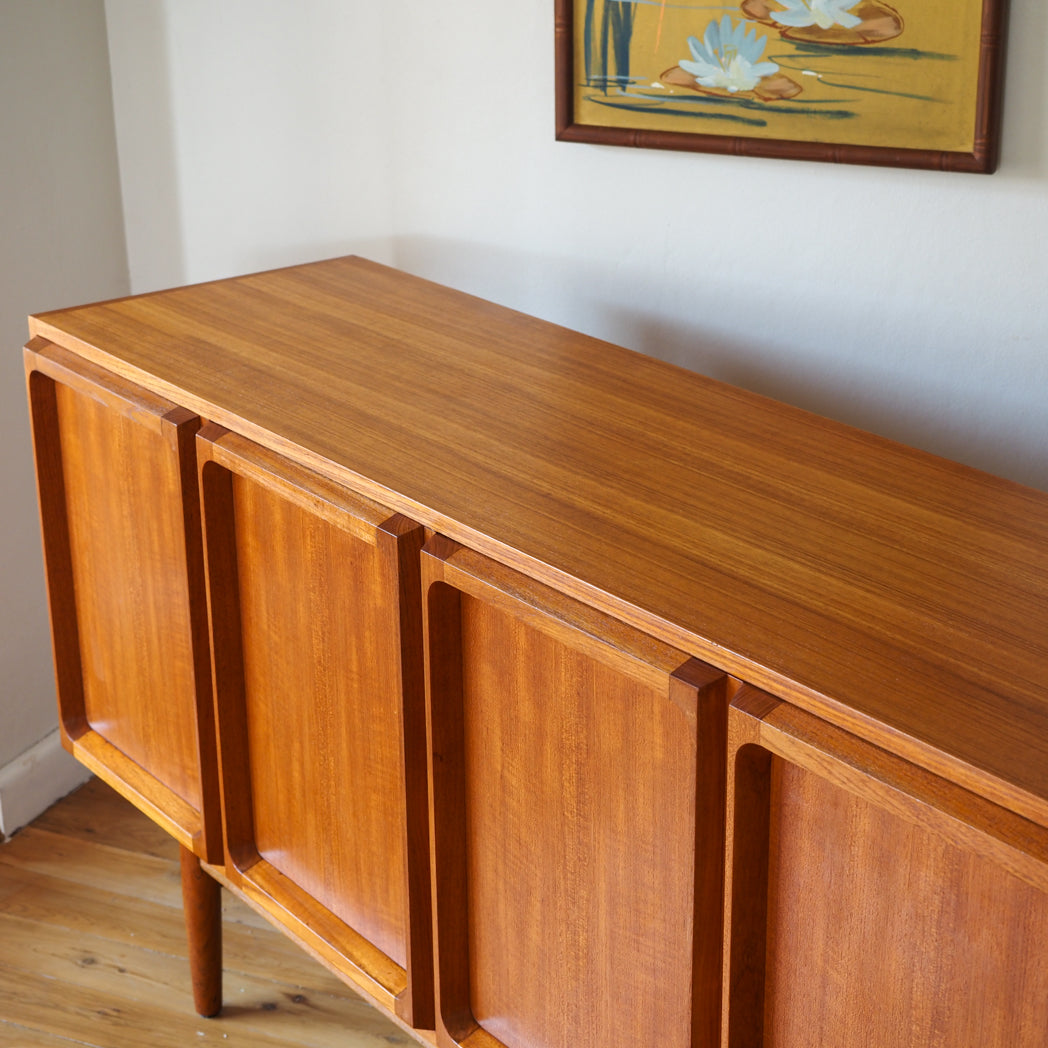 A beautifully balanced example from Chiswell’s sought-after Koben range, crafted in the late 1960s. This generous sideboard features four panelled doors and three drawers, each framed in solid blackwood with a raised lip that highlights the uniform golden teak across the fronts.