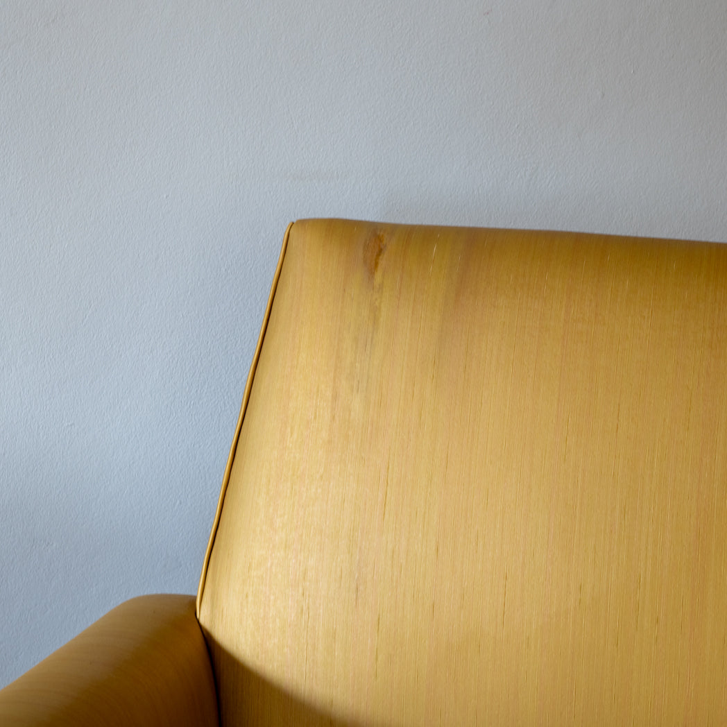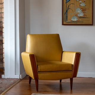 The original gold vinyl is in remarkable condition, a rare survivor from the era, and has been thoroughly cleaned and nourished to maintain its soft lustre and integrity. The exposed timber detailing has been lightly refreshed to celebrate its craftsmanship and natural grain. One chair shows a small blemish in the vinyl, as photographed.