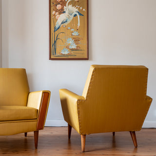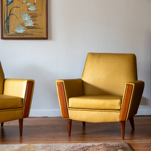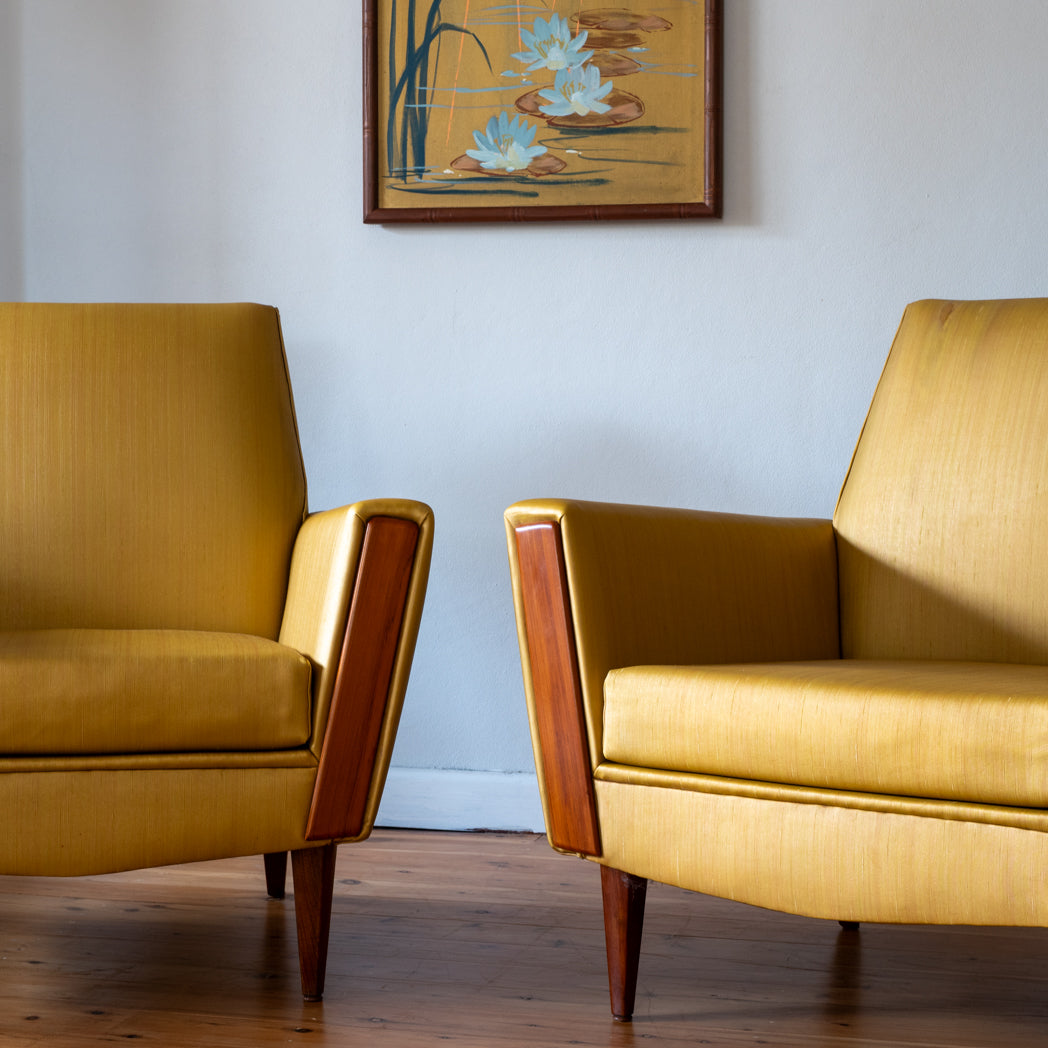 A beautifully preserved pair of armchairs manufactured in 1964 by New Style Upholstery, inspired by Adrian Pearsall’s iconic Gondola series. These chairs capture the sculptural elegance of mid-century Australian design, compact yet commanding, with angular arms, timber insets and tapered legs that give them a poised, architectural presence.