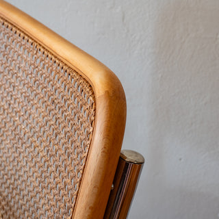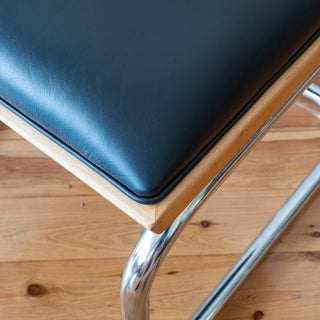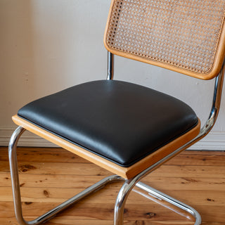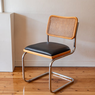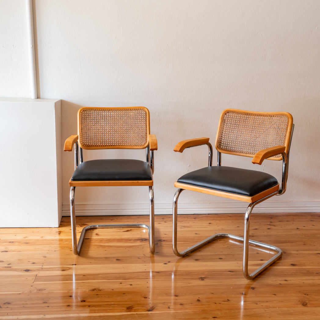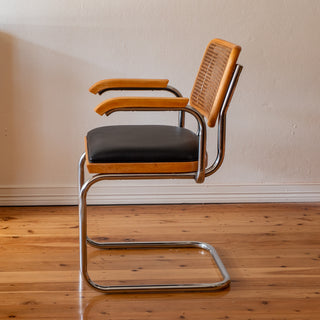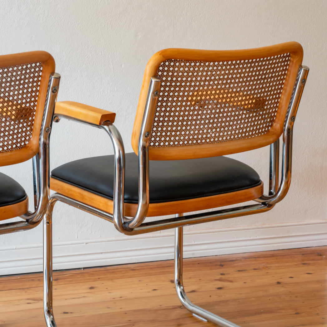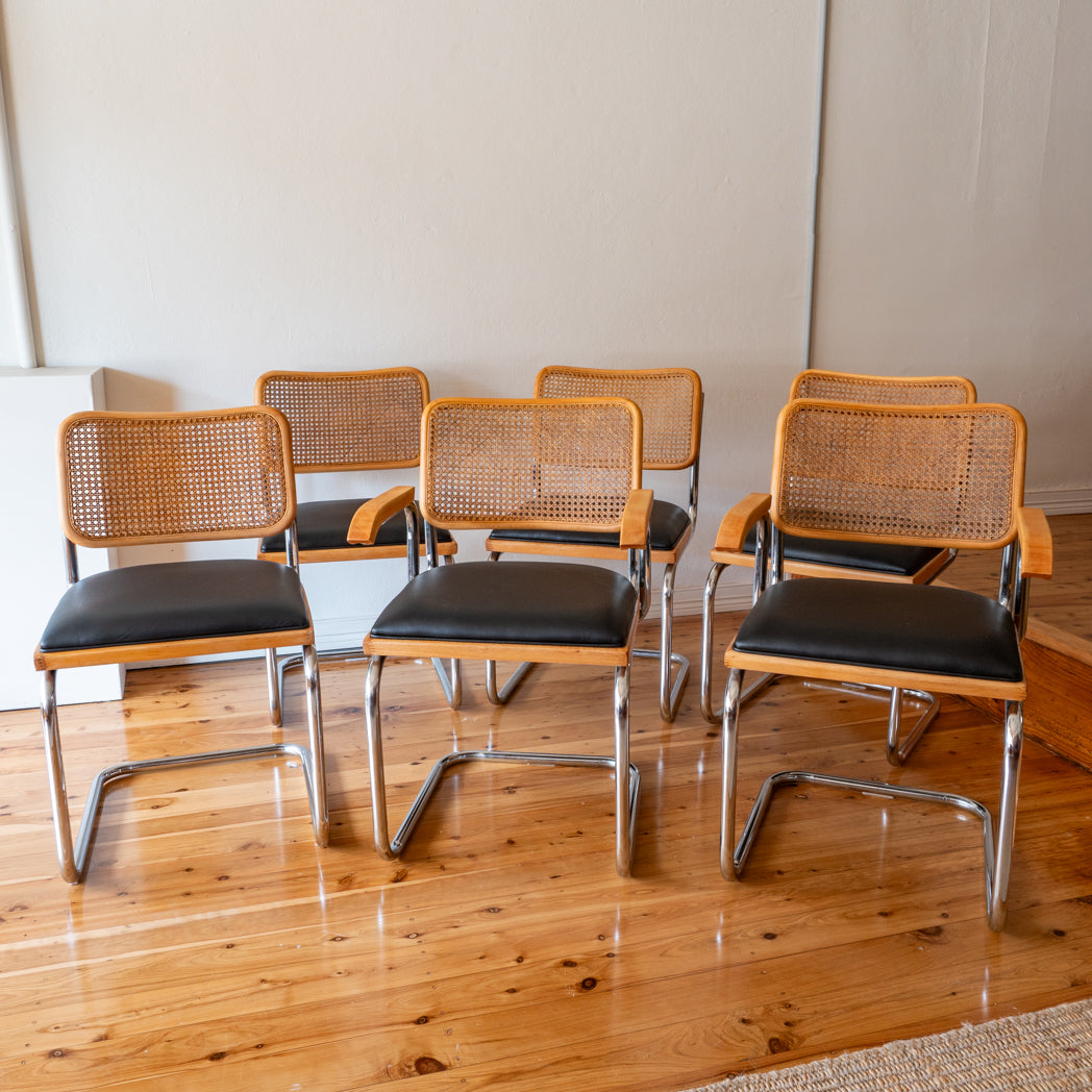 A set of six iconic Bauhaus-inspired Marcel Breuer 'Cesca' style dining chairs. Made in Italy in the 1970s, these exceptional pieces showcase Breuer's signature tubular cantilever steel frame and finely woven cane detailing. The chairs have been carefully restored, finished with a durable hard wax oil and reupholstered in premium NSW Leather in 'Sundance' – Nero, a luxurious full-grain aniline leather, over new foam fillings. The steel frames are in outstanding condition, with minimal pitting. The chairs come as a set of six, two with arms and four without. They present beautifully throughout.