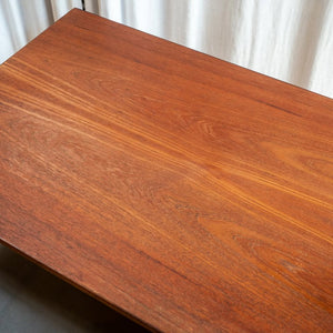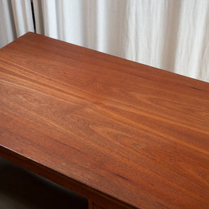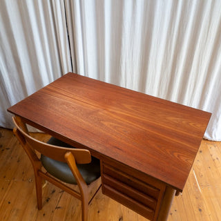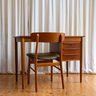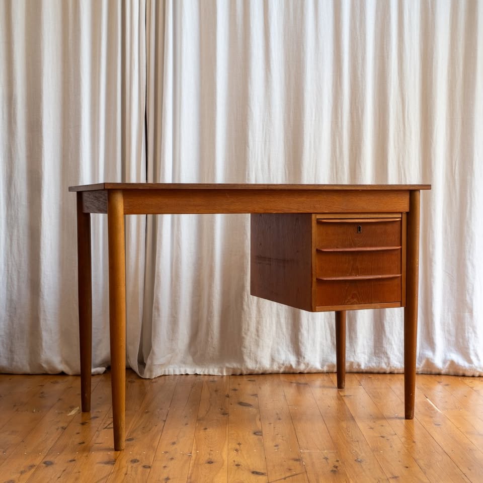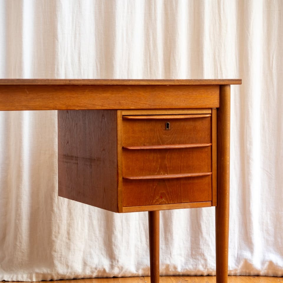 A gorgeous little mid-century desk featuring warm teak veneer, solid lip-edge drawer pulls, and striking natural grain. The top surface shows some unevenness and patchiness due to a previous restoration of water damage, but the piece remains completely functional and displays beautifully. Priced accordingly, sold as is.