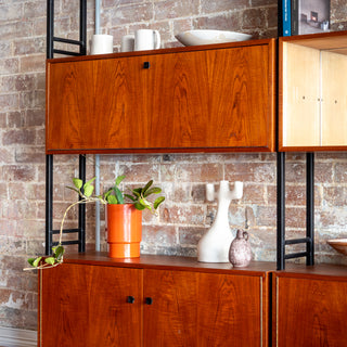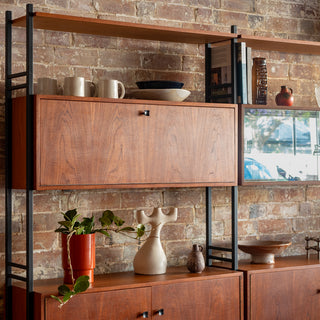 Beautifully designed and highly functional, it features a drop-down bar, a glass front display cabinet, and a mirror back drinks compartment, all elevated by generous storage for books, records, or treasured objects. The shelving offers a balanced mix of open and closed spaces, perfect for styling or everyday practicality.