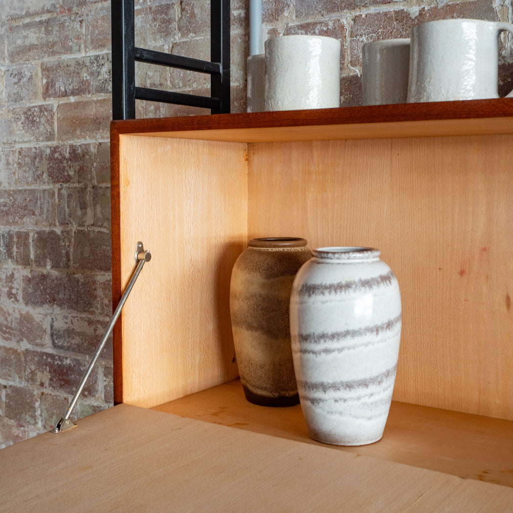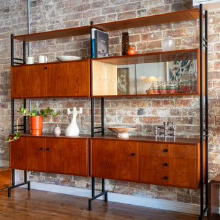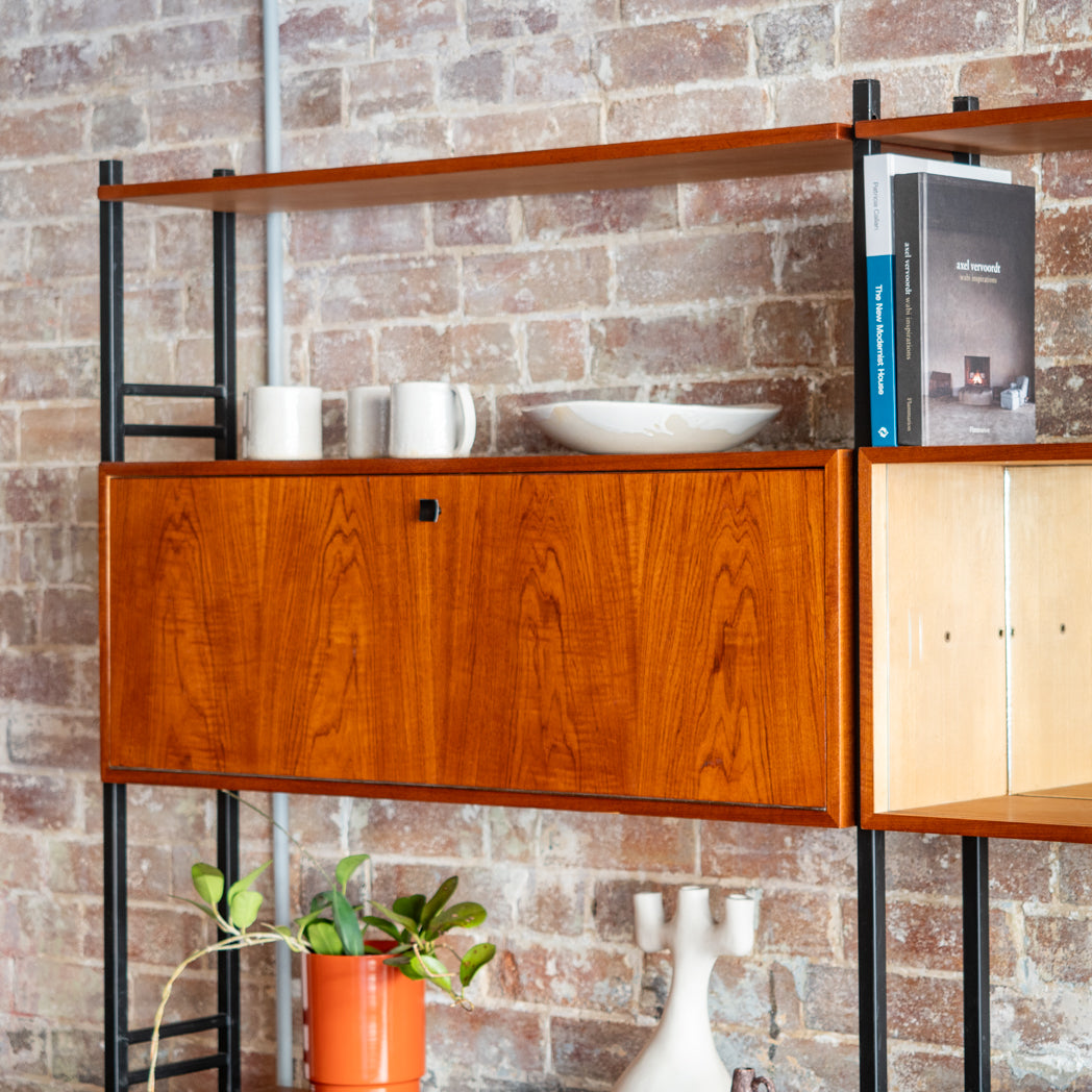 The unit is solid enough to be used as a free-standing room divider thanks to its fully finished teak back, allowing it to sit confidently in the centre of a room. Its clean lines, architectural frame, and warm timber tones make it an exceptional example of Australian mid century design.