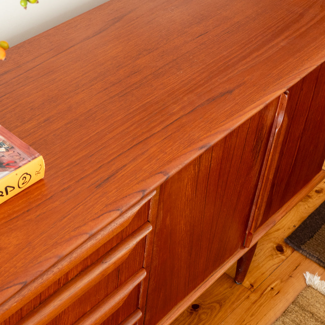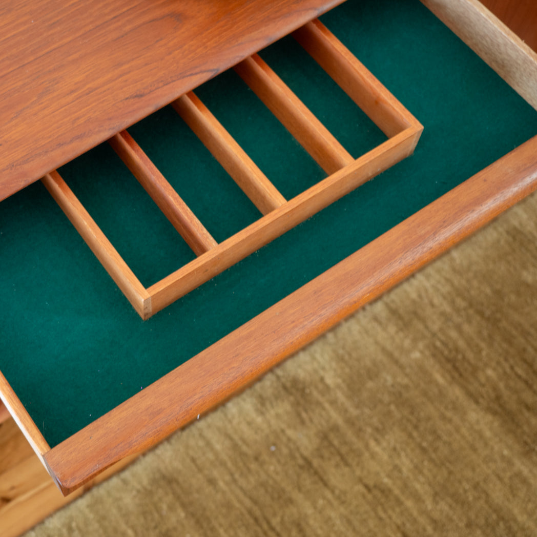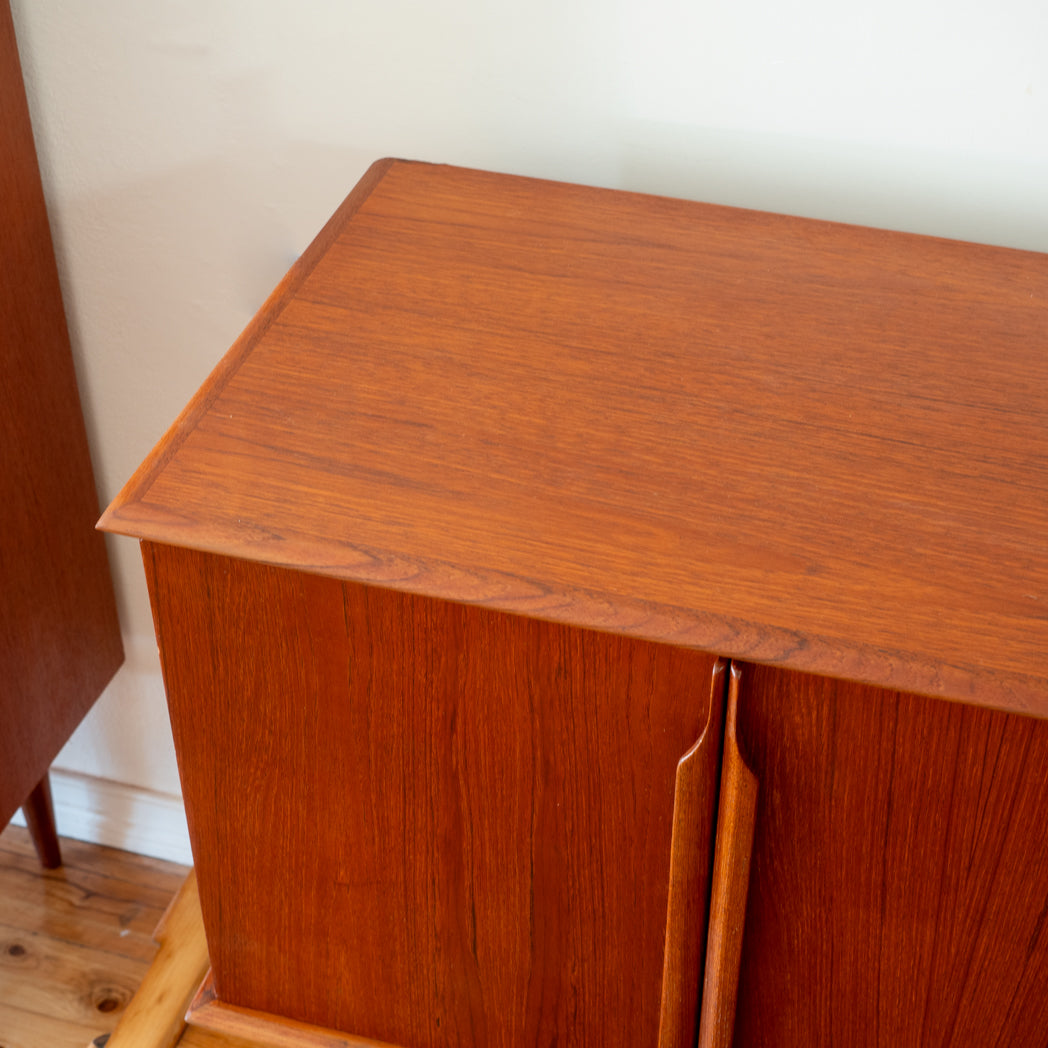 Both the drawers and doors feature Noblett’s signature sculpted lip pulls. We especially love the thick solid timber edging and the rich, dark teak tones that come up beautifully in the light.