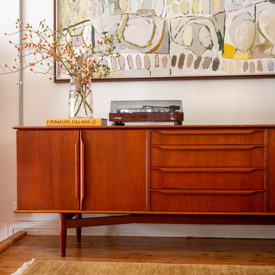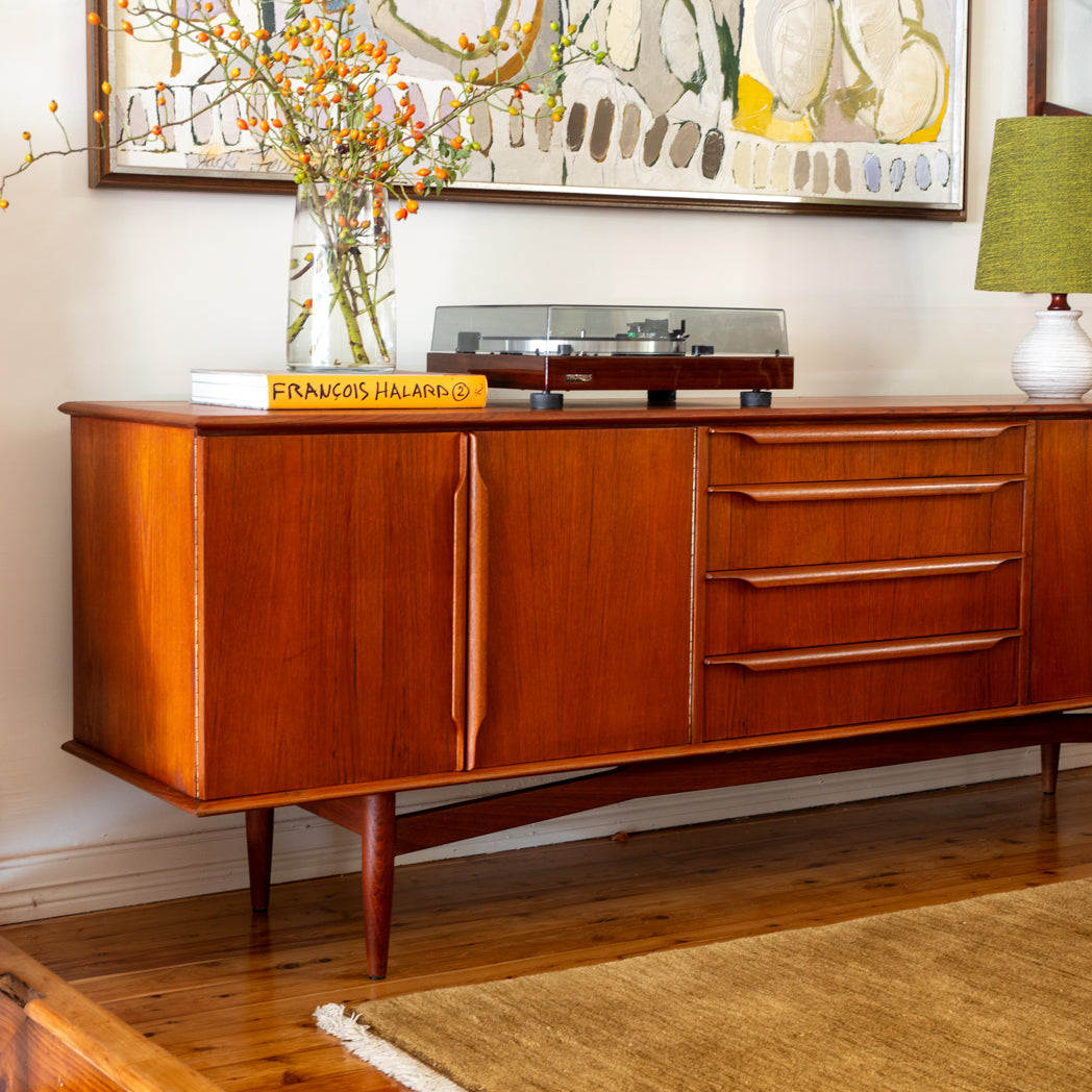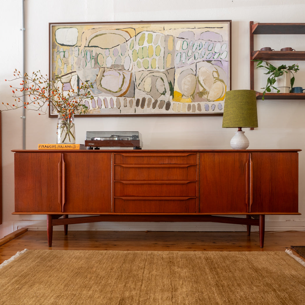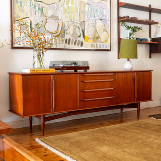 Long and low in classic proportion, it sits on a sculpted solid timber base and has that beautiful, quiet presence these pieces do so well. Two generous double-door cupboards are balanced with four wide drawers through the centre, giving you plenty of practical storage for everyday living.