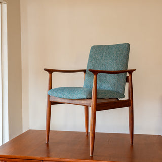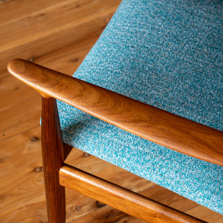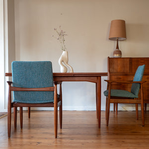 A stunning pair of Parker Carver Chairs (Model #119), reupholstered in Zepel’s ‘Mingle Mangle’ – Cascade, a soft, ocean-toned weave that perfectly complements the sculptural timber frame.