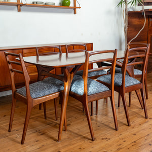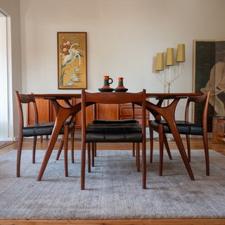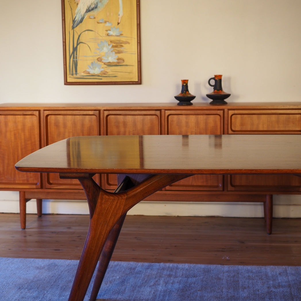 Expertly crafted from solid Blackwood, this stunning dining table embodies modernist elegance with splayed legs and curved supports. The solid timber top features a gently curved form, highlighting both craftsmanship and materiality.