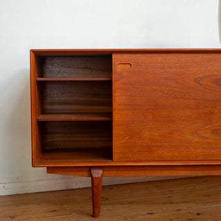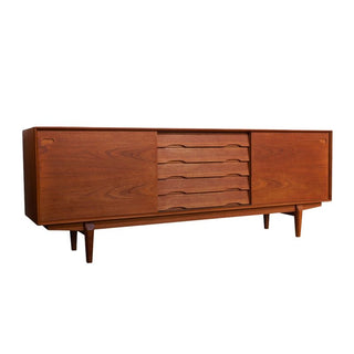 A finely crafted Danish sideboard by Egon Kristensen for Skovby, featuring two smooth-sliding doors and a central bank of five drawers. The doors are fitted with elegant recessed pulls, while the drawers showcase gently sculpted, ergonomic handles.